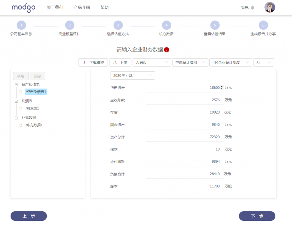 通过模估估对张小泉进行估值:计算最近一年的财务数据(TTM),得到2020-7-1至2021-6-30一年内,营业收入TTM为65190亿,净利润TTM为8866万元。 在模估系统录入张小泉股份有限公司的财务数据及相关信息: