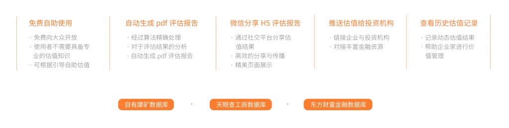 模估估可实现企业在线自助估值、企业价值管理及形象展示、投融资信息披露互动等功能。