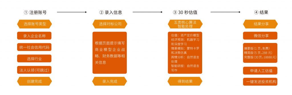 企业在线自助估值:用户通过网站页面导航,选择公司行业及对标公司,填写公司商业属性信息及财务信息,模估估通过多种算法和机器语言实现快速、便捷、高效的估值流程,客户可通过输入最少量的信息,最快速的获得企业的市场定位和综合估值结果。整个过程不需要人工建模与计算,没有人工干预,可实现快速、普惠、公允的估值。