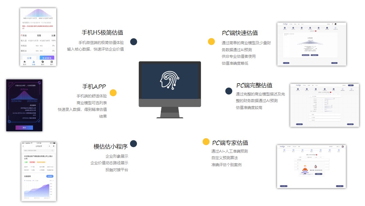 模估提供免费、自助、零门槛的在线估值服务,企业家、投资人、服务商均可使用。模估依托人工智能、大数据、云计算,提供客观、公允、有效、可追溯的估值服务。