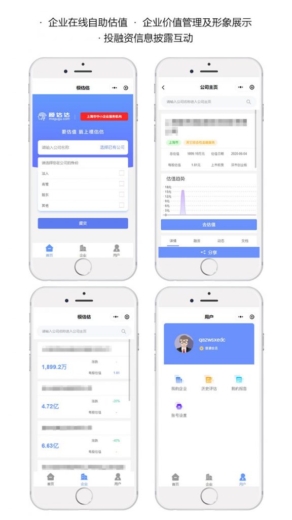 模估估小程序:模估估可实现企业在线自助估值、企业价值管理及形象展示、投融资信息披露互动等功能。
